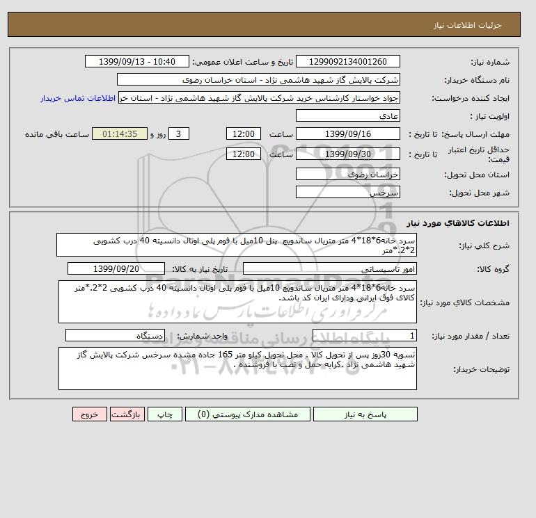 نام دستگاه خریدار:شرکت پالایش گاز شهید هاشمی نژاد - استان خراسان رضوی