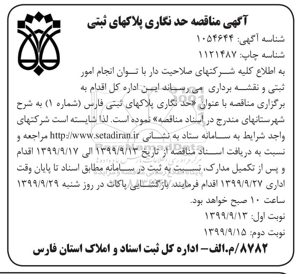 به اطلاع کلیه شرکتهای صلاحیت دار با توان انجام امور ثبتی و نقشه برداری می رساند این اداره کل اقدام به برگزاری مناقصه با عنوان حد نگاری پلاکهای ثبتی فارس شماره 1 به شرح شهرستانهای مندرج در اسناد مناقصه نموده است