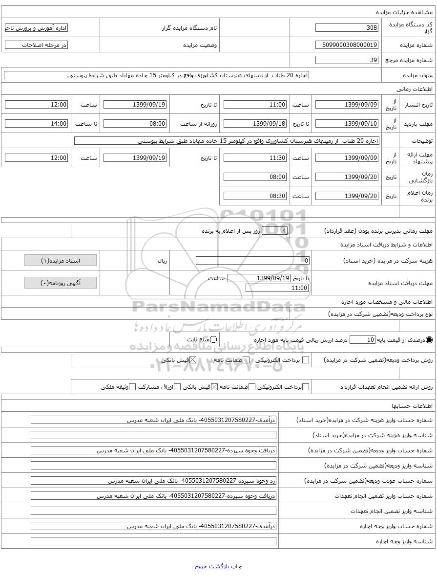 | شماره مزایده | 5199000308000019 | نوع برگزاری مزایده | مزایده عمومی | |
