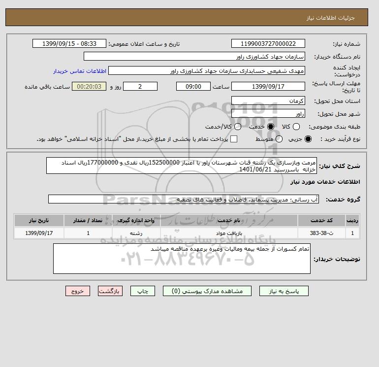 شرح کلی نیاز: مرمت وبازسازی یک رشته قنات شهرستان راور با اعتبار 152500000ریال نقدی و 177000000ریال اسناد خزانه باسررسید 1401/06/21