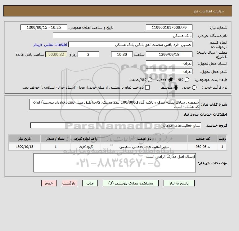 شرح کلی نیاز: شخصی سازی بسته بندی و پاکت گذاری100/000 عدد مسکن کارت(طبق پیش نویس قرارداد پیوست) ایران کد مشابه است
