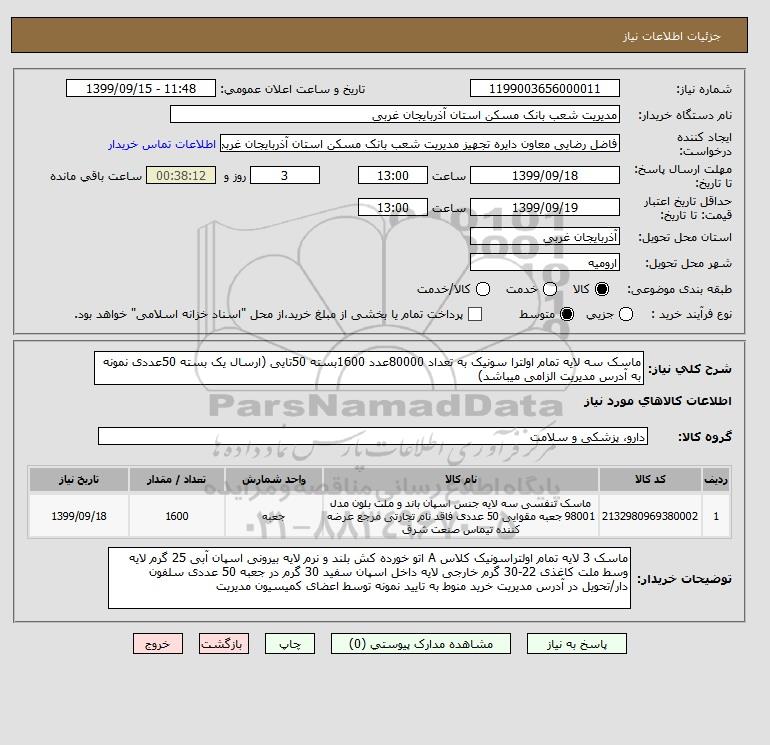 شرح کلی نیاز: ماسک سه لایه تمام اولترا سونیک به تعداد 80000عدد 1600بسته 50تایی (ارسال یک بسته 50عددی نمونه به آدرس مدیریت الزامی میباشد)