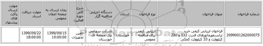 | 2099001262000075 | فراخوان ارزیابی کیفی خرید ترانسفورماتورهای قدرت 132 و 230 کیلوولت و 33 کیلوولت کمکی | ارزیابی کیفی برای مناقصه عمومی | خوزستان | شرکت سهامی برق منطقه ای خوزستان | تامین تجهیزات | 1399/09/15 10:00:00 | 1399/09/22 18:00:00 |