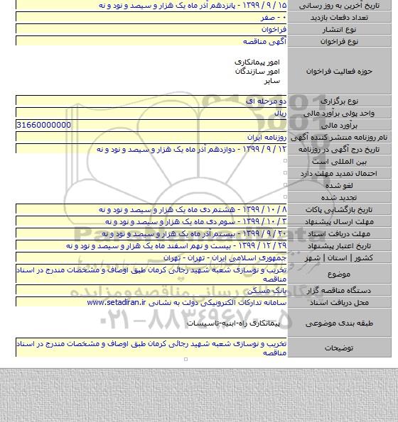 تخریب و نوسازی شعبه شهید رجائی کرمان طبق اوصاف و مشخصات مندرج در اسناد مناقصه
