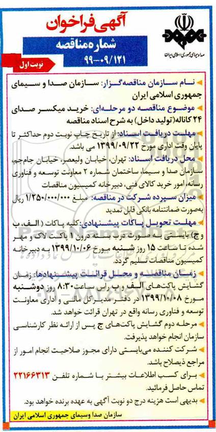- موضوع مناقصه دو مرحله ای: خرید میکسر صدای 24 کاناله (تولید داخل) به شرح اسناد مناقصه