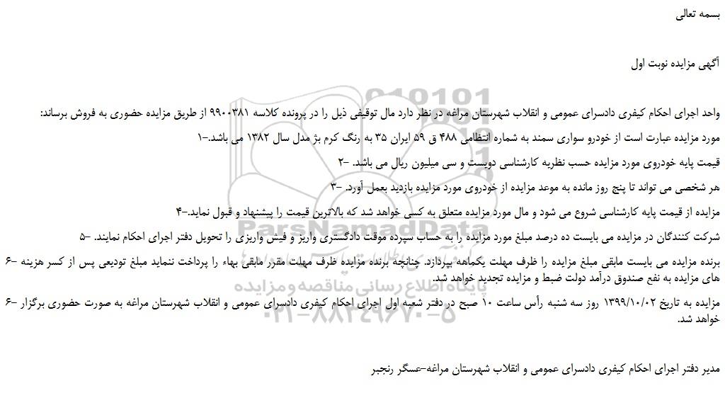 واحد اجرای احکام کیفری دادسرای عمومی و انقلاب شهرستان مراغه در نظر دارد مال توقیفی ذیل را در پرونده کلاسه 9900381 از طریق مزایده حضوری به فروش برساند: