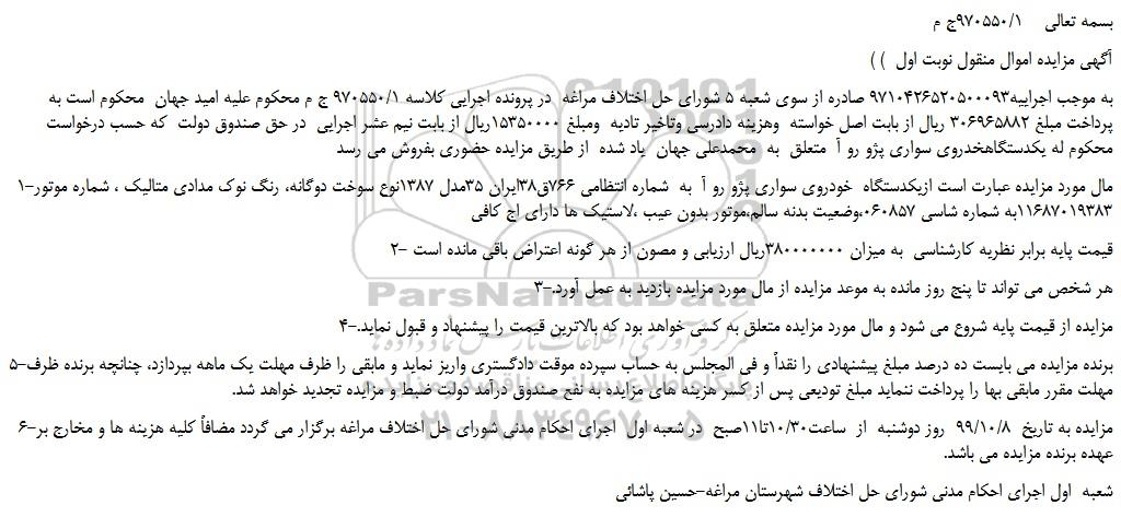 به موجب اجراییه9710426520500093 صادره از سوی شعبه 5 شورای حل اختلاف مراغه در پرونده اجرایی کلاسه 970550/1 ج م محکوم علیه امید جهان محکوم است به پرداخت مبلغ 306965882 ریال از بابت اصل خواسته وهزینه دادرسی وتاخیر تادیه ومبلغ 15350000ریال از بابت نیم عشر اجرایی در حق صندوق دولت که حسب درخواست محکوم له یکدستگاهخدروی سواری پژو رو آ متعلق به محمدعلی جهان یاد شده از طریق مزایده حضوری بفروش می رسد