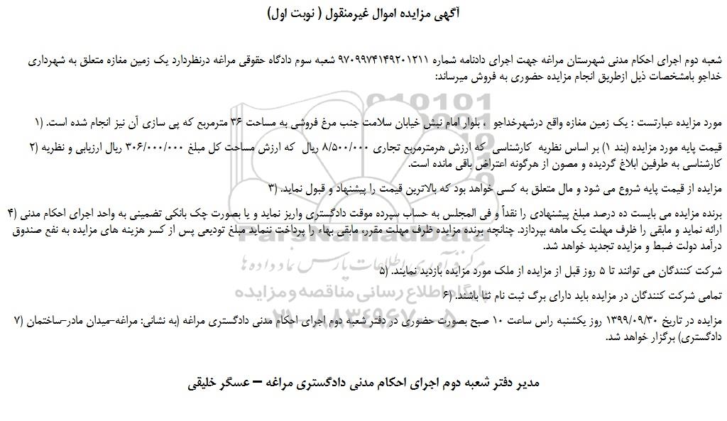 شعبه دوم اجرای احکام مدنی شهرستان مراغه جهت اجرای دادنامه شماره 9709974149201211 شعبه سوم دادگاه حقوقی مراغه درنظردارد یک زمین مغازه متعلق به شهرداری خداجو بامشخصات ذیل ازطریق انجام مزایده حضوری به فروش میرساند: