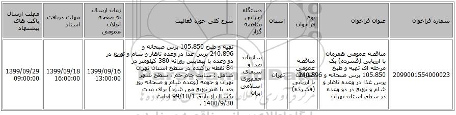 مناقصه، مناقصه عمومی همزمان با ارزیابی (فشرده) یک مرحله ای تهیه و طبخ 105،850 پرس صبحانه و 240،896 پرس غذا در وعده ناهار و شام و توزیع در دو وعده در سطح استان تهران از کلیه افراد متخصص و شرکت‌ها واجد شرایط دعوت به عمل می‌آید در مناقصه با کد خبرگزاری پارس نماد: 2941657 شرکت نمایند. این مناقصه در تاریخ 1399/09/16 شروع و مهلت آن تا تاریخ 1399/09/18 میباشد.
