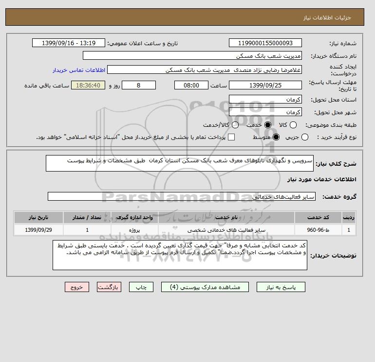 شرح کلی نیاز: سرویس و نگهداری تابلوهای معرف شعب بانک مسکن استان کرمان طبق مشخصات و شرایط پیوست