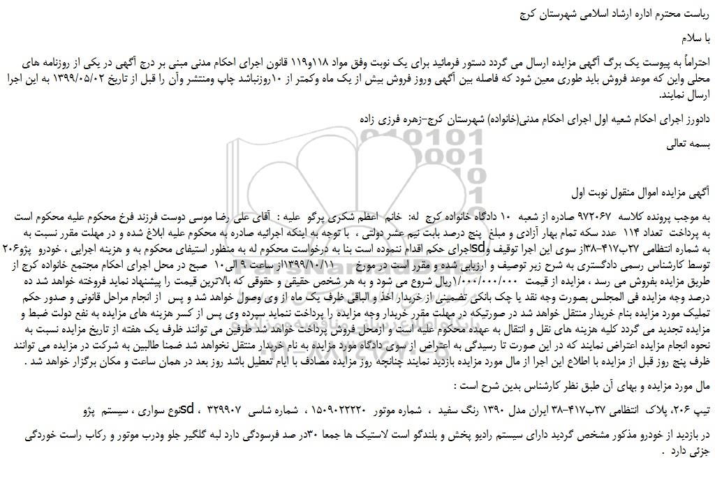 به موجب پرونده کلاسه 972067 صادره از شعبه 10 دادگاه خانواده کرج له: خانم اعظم شکری پرگو علیه : آقای علی رضا موسی دوست فرزند فرخ محکوم علیه محکوم است به پرداخت تعداد 114 عدد سکه تمام بهار آزادی و مبلغ پنج درصد بابت نیم عشر دولتی ، با توجه به اینکه اجرائیه صادره به محکوم علیه ابلاغ شده و در مهلت مقرر نسبت به اجرای حکم اقدام ننموده است بنا به درخواست محکوم له به منظور استیفای محکوم به و هزینه اجرایی ، خودرو پژو206sdبه شماره انتظامی 27ب417-38از سوی این اجرا توقیف و توسط کارشناس رسمی دادگستری به شرح زیر توصیف و ارزیابی شده و مقرر است در مورخ 1399/10/11از ساعت 9 الی10 صبح در محل اجرای احکام مجتمع خانواده کرج از طریق مزایده بفروش می رسد ، مزایده از قیمت 1/000/000/000ریال شروع می شود و به هر شخص حقیقی و حقوقی که بالاترین قیمت را پیشنهاد نماید فروخته خواهد شد ده درصد وجه مزایده فی المجلس بصورت وجه نقد یا چک بانکی تضمینی از خریدار اخذ و الباقی ظرف یک ماه از وی وصول خواهد شد و پس از انجام مراحل قانونی و صدور حکم تملیک مورد مزایده بنام خریدار منتقل خواهد شد در صورتیکه در مهلت مقرر خریدار وجه مزایده را پرداخت ننماید سپرده وی پس از کسر هزینه های مزایده به نفع دولت ضبط و مزایده تجدید می گردد کلیه هزینه های نقل و انتقال به عهده محکوم علیه است و ازمحل فروش پرداخت خواهد شد طرفین می توانند ظرف یک هفته از تاریخ مزایده نسبت به نحوه انجام مزایده اعتراض نمایند که در این صورت تا رسیدگی به اعتراض از سوی دادگاه مورد مزایده به نام خریدار منتقل نخواهد شد ضمنا طالبین به شرکت در مزایده می توانند ظرف پنج روز قبل از مزایده با اطلاع این اجرا از مال مورد مزایده بازدید نمایند چنانچه روز مزایده مصادف با ایام تعطیل باشد روز بعد در همان ساعت و مکان برگزار خواهد شد .