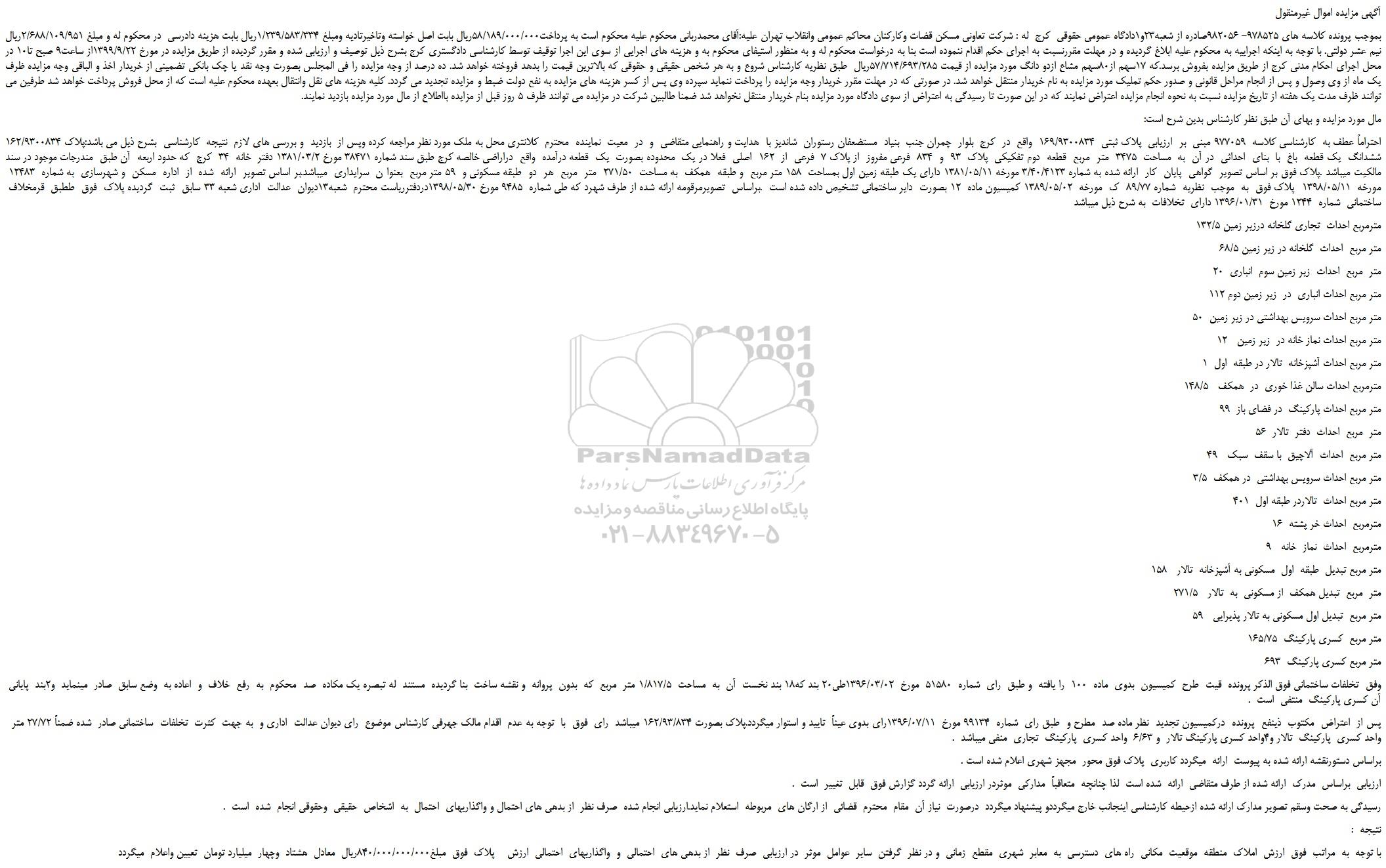 بموجب پرونده کلاسه های 978525- 982056صادره از شعبه23و1دادگاه عمومی حقوقی کرج له : شرکت تعاونی مسکن قضات وکارکنان محاکم عمومی وانقلاب تهران علیه:آقای محمدربانی محکوم علیه محکوم است به پرداخت58/189/000/000ریال بابت اصل خواسته وتاخیرتادیه ومبلغ 1/239/583/334ریال بابت هزینه دادرسی در محکوم له و مبلغ 2/688/109/951ریال نیم عشر دولتی. با توجه به اینکه اجراییه به محکوم علیه ابلاغ گردیده و در مهلت مقررنسبت به اجرای حکم اقدام ننموده است بنا به درخواست محکوم له و به منظور استیفای محکوم به و هزینه های اجرایی از سوی این اجرا توقیف توسط کارشناسی دادگستری کرج بشرح ذیل توصیف و ارزیابی شده و مقرر گردیده از طریق مزایده در مورخ 1399/9/22از ساعت9 صبح تا10 در محل اجرای احکام مدنی کرج از طریق مزایده بفروش برسد.که 17سهم از80سهم مشاع ازدو دانگ مورد مزایده از قیمت 57/714/693/285ریال طبق نظریه کارشناس شروع و به هر شخص حقیقی و حقوقی که بالاترین قیمت را بدهد فروخته خواهد شد. ده درصد از وجه مزایده را فی المجلس بصورت وجه نقد یا چک بانکی تضمینی از خریدار اخذ و الباقی وجه مزایده ظرف یک ماه از وی وصول و پس از انجام مراحل قانونی و صدور حکم تملیک مورد مزایده به نام خریدار منتقل خواهد شد. در صورتی که در مهلت مقرر خریدار وجه مزایده را پرداخت ننماید سپرده وی پس از کسر هزینه های مزایده به نفع دولت ضبط و مزایده تجدید می گردد. کلیه هزینه های نقل وانتقال بعهده محکوم علیه است که از محل فروش پرداخت خواهد شد طرفین می توانند ظرف مدت یک هفته از تاریخ مزایده نسبت به نحوه انجام مزایده اعتراض نمایند که در این صورت تا رسیدگی به اعتراض از سوی دادگاه مورد مزایده بنام خریدار منتقل نخواهد شد ضمنا طالبین شرکت در مزایده می توانند ظرف 5 روز قبل از مزایده بااطلاع از مال مورد مزایده بازدید نمایند.
