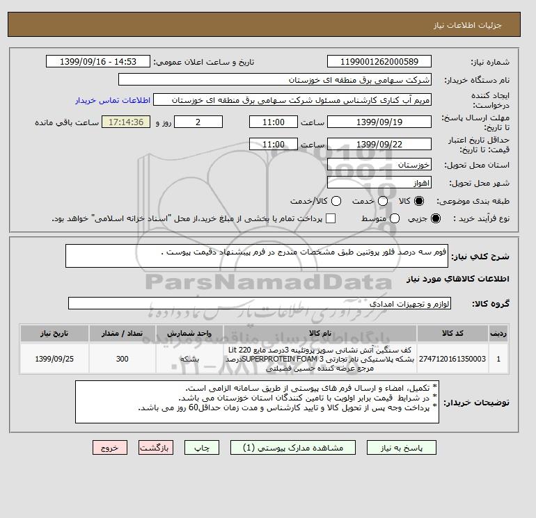شرح کلی نیاز: فوم سه درصد فلور پروتنین طبق مشخصات مندرج در فرم پیبشنهاد دقیمت پیوست .