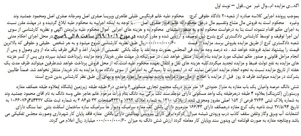 بموجب پرونده اجرایی کلاسه صادره از شعبه20 دادگاه حقوقی کرج:    محکوم علیه خانم فرنگیس خلیلی طاهری وپریسا صفری اصل ومرجانه صفری اصل ومحمود جمشید وند وغیره    محکوم است به فروش مال مشاع وتقسیم مال درحق محکوم له خانم افروز صفری اصل    . با توجه به اینکه اجراییه به محکوم علیه ابلاغ گردیده و در مهلت مقرر نسبت به اجرای حکم اقدام ننموده است بنا به درخواست محکوم له و به منظور استیفای  محکوم به و هزینه های اجرایی  اموال محکوم علیه برابرمتن اگهی و نظریه کارشناسی از سوی این اجرا توقیف و توسط کارشناس دادگستری کرج بشرح ذیل توصیف و ارزیابی شده و مقرر گردیده در مورخ 99/10/1از ساعت 8 الی 9صبح در محل اجرای احکام مدنی شعبه دادگستری کرج از طریق مزایده بفروش برسد. مزایده از قیمت        000/000/000/60ریال طبق نظریه کارشناسی شروع میشود و به هر شخص  حقیقی و حقوقی که بالاترین قیمت را پیشنهاد نماید فروخته خواهد شد . ده درصد وجه مزایده فی المجلس بصورت وجه نقد یا چک بانکی  تضمینی از خریدار اخذ و الباقی ظرف یک ماه از وی وصول و پس از انجام مراحل قانونی و صدور حکم تملیک مورد مزایده بنام خریدار منتقل خواهد شد . در صورتیکه در مهلت مقرر خریدار وجه مزایده راپرداخت ننماید سپرده وی پس از کسر هزینه های مزایده به نفع دولت ضبط و مزایده تجدید میگردد.کلیه هزینه های نقل و انتقال بعهده محکوم علیه است.که از محل فروش پرداخت خواهد شد.طرفین میتوانند ظرف مدت یک هفته از تاریخ مزایده نسبت به نحوه انجام مزایده اعتراض نمایند که در اینصورت تا رسیدگی به اعتراض از سوی دادگاه مورد مزایده به نام خریدار منتقل نخواهد شد. ضمناً طالبین بشرکت در مزایده میتوانند ظرف 5 روز  قبل از مزایده با اطلاع از مال مورد مزایده بازدید نمایند. مال مورد مزایده و بهای آن طبق نظر کارشناس بدین شرح است: