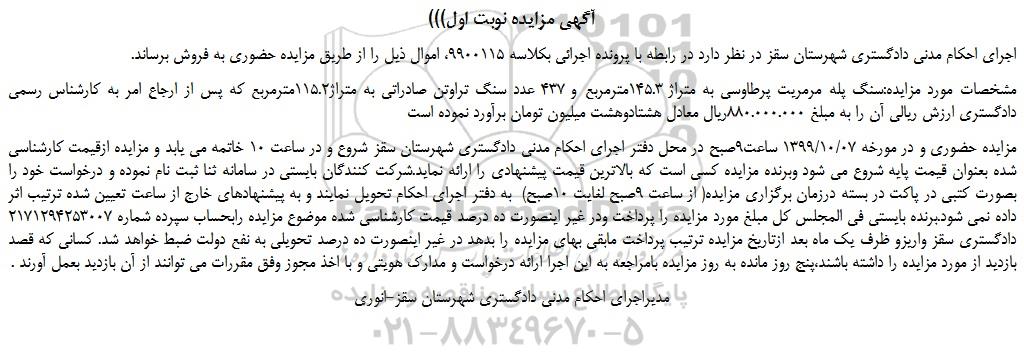اجرای احکام مدنی دادگستری شهرستان سقز در نظر دارد در رابطه با پرونده اجرائی بکلاسه 9900115، اموال ذیل را از طریق مزایده حضوری به فروش برساند.