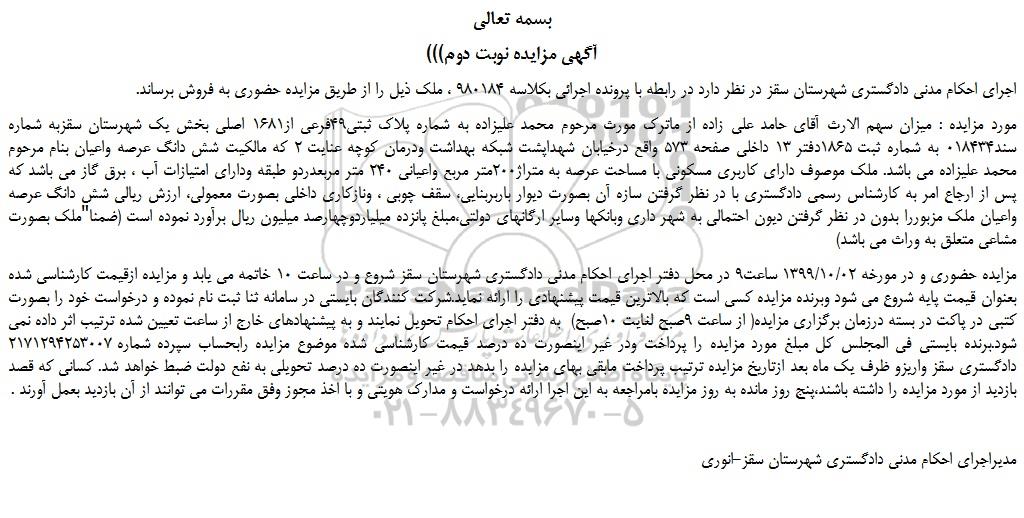 اجرای احکام مدنی دادگستری شهرستان سقز در نظر دارد در رابطه با پرونده اجرائی بکلاسه 980184 ، ملک ذیل را از طریق مزایده حضوری به فروش برساند.