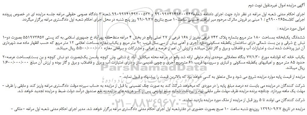 - مزایده در تاریخ 1399/09/27 روزپنج شنبه ساعت 10 صبح بصورت حضوری در دفترشعبه اول اجرای احکام مدنی دادگستری مراغه برگزار خواهد شد. مدیر اجرای احکام مدنی شعبه اول مراغه - ملکی