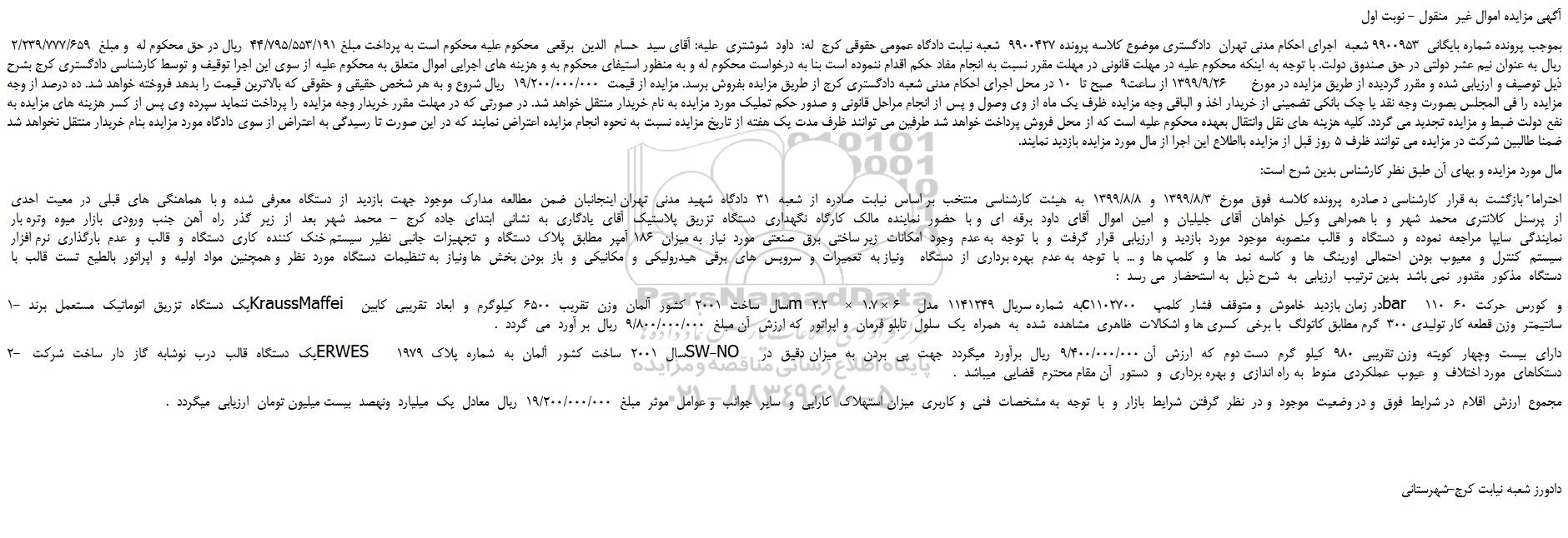 بموجب پرونده شماره بایگانی 9900953 شعبه اجرای احکام مدنی تهران دادگستری موضوع کلاسه پرونده 9900427 شعبه نیابت دادگاه عمومی حقوقی کرج له: داود شوشتری علیه: آقای سید حسام الدین برقعی محکوم علیه محکوم است به پرداخت مبلغ 44/795/553/191 ریال در حق محکوم له و مبلغ 2/239/777/659 ریال به عنوان نیم عشر دولتی در حق صندوق دولت. با توجه به اینکه محکوم علیه در مهلت قانونی در مهلت مقرر نسبت به انجام مفاد حکم اقدام ننموده است بنا به درخواست محکوم له و به منظور استیفای محکوم به و هزینه های اجرایی اموال متعلق به محکوم علیه از سوی این اجرا توقیف و توسط کارشناسی دادگستری کرج بشرح ذیل توصیف و ارزیابی شده و مقرر گردیده از طریق مزایده در مورخ 1399/9/26 از ساعت9 صبح تا 10 در محل اجرای احکام مدنی شعبه دادگستری کرج از طریق مزایده بفروش برسد. مزایده از قیمت 19/200/000/000 ریال شروع و به هر شخص حقیقی و حقوقی که بالاترین قیمت را بدهد فروخته خواهد شد. ده درصد از وجه مزایده را فی المجلس بصورت وجه نقد یا چک بانکی تضمینی از خریدار اخذ و الباقی وجه مزایده ظرف یک ماه از وی وصول و پس از انجام مراحل قانونی و صدور حکم تملیک مورد مزایده به نام خریدار منتقل خواهد شد. در صورتی که در مهلت مقرر خریدار وجه مزایده را پرداخت ننماید سپرده وی پس از کسر هزینه های مزایده به نفع دولت ضبط و مزایده تجدید می گردد. کلیه هزینه های نقل وانتقال بعهده محکوم علیه است که از محل فروش پرداخت خواهد شد طرفین می توانند ظرف مدت یک هفته از تاریخ مزایده نسبت به نحوه انجام مزایده اعتراض نمایند که در این صورت تا رسیدگی به اعتراض از سوی دادگاه مورد مزایده بنام خریدار منتقل نخواهد شد ضمنا طالبین شرکت در مزایده می توانند ظرف 5 روز قبل از مزایده بااطلاع این اجرا از مال مورد مزایده بازدید نمایند.