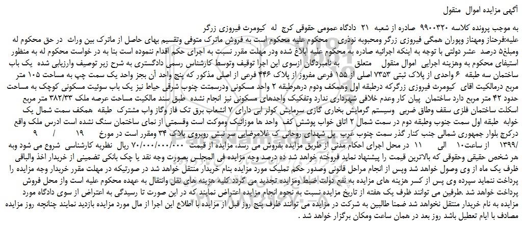 به موجب پرونده کلاسه 9900320 صادره از شعبه 21 دادگاه عمومی حقوقی کرج له کیومرث فیروزی زرگر علیه:فرحناز ومهناز وپوران همگی فیروزی زرگر ومحبوبه نوذری محکوم علیه محکوم است به فروش ماترک متوفی وتقسیم بهای حاصل از ماترک بین وراث در حق محکوم له ومبلغ5 درصد عشر دولتی با توجه به اینکه اجرائیه صادره به محکوم علیه ابلاغ شده ودر مهلت مقرر نسبت به اجرای حکم اقدام ننموده است بنا به در خواست محکوم له به منظور استیفای محکوم به وهزینه اجرایی اموال منقول متعلق به نامبردگان ازسوی این اجرا توقیف وتوسط کارشناس رسمی دادگستری به شرح زیر توصیف وارزیابی شده یک باب ساختمان سه طبقه 6 واحدی از پلاک ثبتی 7353 اصلی از 155 فرعی مفروز از پلاک 446 فرعی از اصلی مذکور که پنج واحد آن بجز واحد یک سمت چپ به مساحت 105 متر مربع درمالکیت اقای کیومرث فیروزی زرگرکه درطبقه اول وهمکف ودوم درهرطبقه 2 واحد مسکونی ودرسمتت چنوب شرقی حیاط نیز یک باب سوئیت مسکونی کوچک به مساحت حدود 42 متر مربع دارد ساختمان پیان کار وعدم خلافی شهرداری ندارد وتفکیک واحدهای مسکونی نیز انجام نشده طبق سند مالکیت مساحت عرصه ملک 382/33 متر مربع اسکلت ساختمان فلزی سقف وطاق ضربی وسیستم گرمایش بخاری گازی سرمایش کولر ابی دارای 7 انشعاب برق تک فاز وگاز واب مشترک طبقه همکف سمت شمال یک خوابه طبقه اول سمت جنوب وطبقه دوم در سمت شمال 2 اتاق خواب پوشش کف واحد ها موزائیک وموکت است وقسمتی از نمای ساختمان سنگ نشده است ادرس ملک واقع درکرج بلوار جمهوری شمالی جنب کنار گذر سمت چنوب غرب پل شهدای روحانی ک غلامرضایی سر نبش روبروی پلاک 34 ومقرر است در مورخ 19 / 9 /1399 از ساعت10 الی 11 در محل اجرای احکام مدنی از طریق مزایده بفروش می رسد، مزایده از قیمت 70/000/000/000 ریال نظریه کارشناسی شروع می شود وبه هر شخص حقیقی وحقوقی که بالاترین قیمت را پیشنهاد نماید فروخته خواهد شد ده درصد وجه مزایده فی المجلس بصورت وجه نقد یا چک بانکی تضمینی از خریدار اخذ والباقی ظرف یک ماه از وی وصول خواهد شد وپس از انجام مراحل قانونی وصدور حکم تملیک مورد مزایده بنام خریدار منتقل خواهد شد در صورتیکه در مهلت مقرر خریدار وجه مزایده را پرداخت ننماید سپرده وی پس از کسر هزینه های مزایده به نفع دولت ضبط ومزایده تجدید می گردد کلیه هزینه های نقل وانتقال به عهده محکوم علیه است واز محل فروش پرداخت خواهد شد .طرفین می توانند ظرف یک هفته از تاریخ مزایده نسبت به نحوه انجام مزایده اعتراض نمایند که در این صورت تا رسیدگی به اعتراض از سوی دادگاه مورد مزایده به نام خریدار منتقل نخواهد شد ضمنا طالبین به شرکت در مزایده می توانند ظرف پنج روز قبل از مزایده با اطلاع این اجرا از مال مورد مزایده بازدید نمایند چنانچه روز مزایده مصادف با ایام تعطیل باشد روز بعد در همان ساعت ومکان برگزار خواهد شد .
