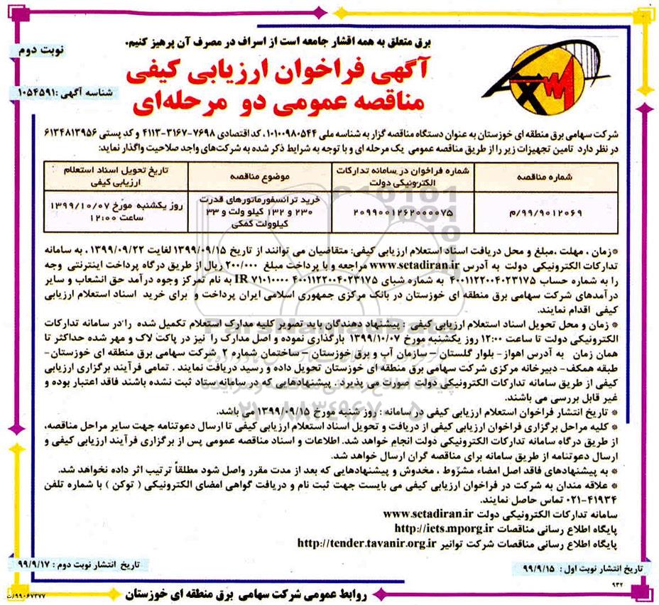 | 99/9012069/م | 2099001262000075 | خرید ترانسفورماتورهای قدرت 230 و 132 کیلو ولت و 33 کیلوولت کمکی |