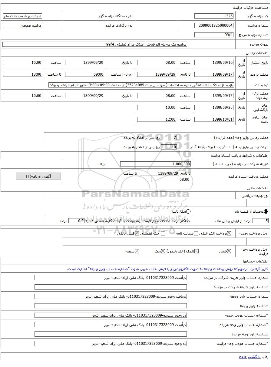 مزایده عمومی مزایده، مزایده یک مرحله ای فروش املاک مازاد تملیکی 99/4 برگزار میگردد. از کلیه افراد متخصص و شرکت‌های واجد شرایط دعوت به عمل می‌آید تا در این مزایده با کد خبرگزاری پارس نماد : 2945120 شرکت نمایند تاریخ شروع مزایده : 1399/09/16 مهلت شرکت در مزایده: تا پایان روز 1399/09/29 مکان برگزاری اموال واگذاری استان‌های آذربایجان شرقی و دسته‌بندی‌های مربوط به این حراجی املاک و زمین میباشد.