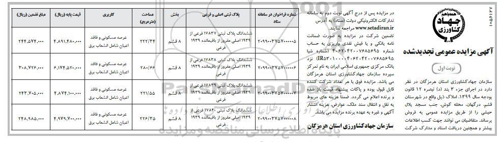 مزایده عمومی مزایده فروش املاک کاربری مسکونی نوبت اول برگزار میگردد. از کلیه افراد متخصص و شرکتهای واجد شرایط دعوت به عمل میآید تا در این مزایده با کد خبرگزاری پارس نماد : 2945334 شرکت نمایند تاریخ شروع مزایده : 1399/09/17 مهلت شرکت در مزایده: تا پایان روز 1399/10/07 مکان برگزاری اموال واگذاری استانهای مزایدات استان هرمزگان و دستهبندیهای مربوط به این حراجی املاک و زمین میباشد.
