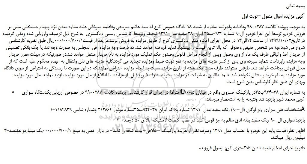 به موجب پرونده کلاسه 9900287 ودادنامه واجرائیه صادره از شعبه 18 دادگاه عمومی کرج له سید هاشم میریحی وفاطمه میرخانی علیه ستاره معدن نژاد وبهنام حسنخانی مبنی بر فروش خودرو توسط این اجرا خودرو ال90 شماره 924-ب35 ایران 38 سفید مدل 1391 توقیف وتوسط کارشناس رسمی دادگستری به شرح ذیل توصیف وارزیابی شده ومقرر گردیده در تاریخ1399/10/02 از ساعت 12الی13 در محل اجرای احکام مدنی دادگستری کرج از طریق مزایده به فروش برسد.مزایده از قیمت000/000/700/1ریال طبق نظریه کارشناسی شروع می شود وبه هر شخص حقیقی وحقوقی که بالا ترین قیمت را پیشنهاد نماید فروخته خواهد شد. ده درصد وجه مزایده فی المجلس به صورت وجه نقد یا چک بانکی تضمینی از خریدار اخذ والباقی ظرف یک ماه از وی وصول وپس از انجام مراحل قانونی وصدور حکم تملیک مورد مزایده به نام خریدار منتقل خواهد شد.در صورتیکه در مهلت مقرر خریدار وجه مزایده راپرداخت ننماید سپرده وی پس از کسر هزینه های مزایده به نفع دولت ضبط ومزایده تجدید می گردد.کلیه هزینه های نقل وانتقال به عهده محکوم علیه است که از محل فروش پرداخت خواهد شد. طرفین میتوانند ظرف مدت یک هفته از تاریخ مزایده نسبت به انجام مزایده اعتراض نمایند.که در این صورت تا رسیدگی به اعتراض از سوی دادگاه مورد مزایده به نام خریدار منتقل نخواهد شد. ضمنا طالبین به شرکت در مزایده میتوانند ظرف 5 روز قبل از مزایده با اطلاع از مال مورد مزایده بازدید نمایند. مال مورد مزایده وبهای ان طبق نظر کارشناس بدین شرح است: