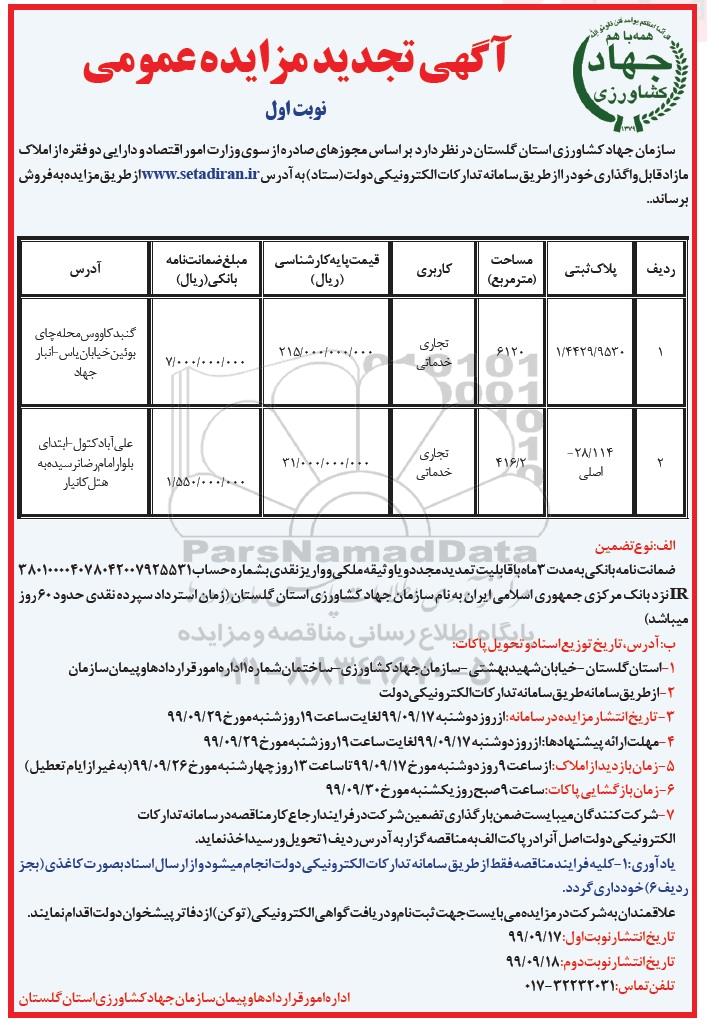 مزایده عمومی مزایده تجدید فروش دو فقره از املاک مازاد تجاری و خدماتی نوبت اول برگزار میگردد. از کلیه افراد متخصص و شرکت‌های واجد شرایط دعوت به عمل می‌آید تا در این مزایده با کد خبرگزاری پارس نماد : 2945795 شرکت نمایند تاریخ شروع مزایده : 1399/09/17 مهلت شرکت در مزایده: تا پایان روز 1399/09/29 مکان برگزاری اموال واگذاری استان‌های مزایدات استان گلستان و دسته‌بندی‌های مربوط به این حراجی املاک و زمین میباشد.