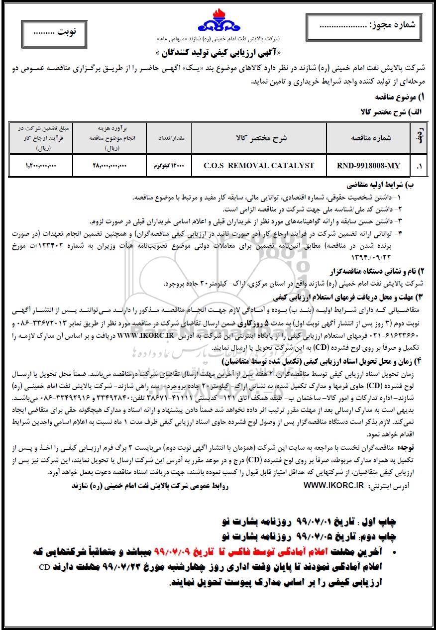 | RND-9918008-MY | C.O.S REMOVAL CATALYST | 14000 کیلوگرم | 28.000.000.000 | 1.400.000.000 |
