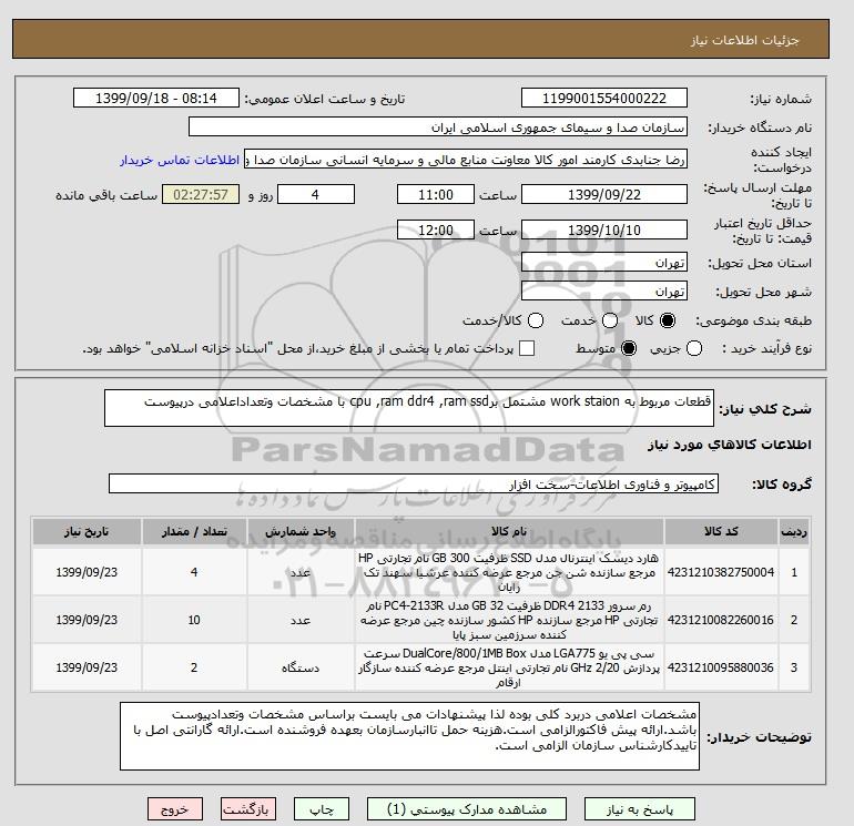 شرح کلی نیاز: قطعات مربوط به work staion مشتمل برcpu ,ram ddr4 ,ram ssd با مشخصات وتعداداعلامی درپیوست