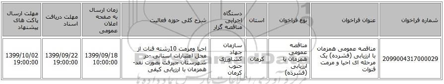| 2099004317000029 | مناقصه عمومی همزمان با ارزیابی (فشرده) یک مرحله ای احیا و مرمت قنوات | مناقصه عمومی همزمان با ارزیابی (فشرده) | کرمان | سازمان جهاد کشاورزی جنوب کرمان | احیا ومرمت 10رشته قنات از محل اعتبارات استانی -در شهرستان جیرفت بصورت نقد-همزمان با ارزیابی کیفی | 1399/09/18 10:00:00 | 1399/09/22 19:00:00 | 1399/10/02 19:00:00 |