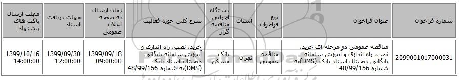 2099001017000031 | مناقصه عمومی دو مرحله ای خرید، نصب، راه اندازی و آموزش سامانه بایگانی دیجیتال اسناد بانک (DMS)به شماره 48/99/156 | مناقصه عمومی | تهران | بانک مسکن | خرید، نصب، راه اندازی و آموزش سامانه بایگانی دیجیتال اسناد بانک (DMS)به شماره 48/99/156 | 1399/09/18 09:00:00 | 1399/09/30 12:00:00 | 1399/10/16 14:00:00 |