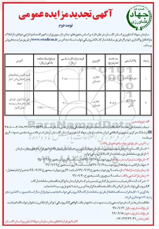 مزایده عمومی مزایده تجدید فروش دو فقره از املاک مازاد تجاری و خدماتی نوبت دوم برگزار میگردد. از کلیه افراد متخصص و شرکتهای واجد شرایط دعوت به عمل میآید تا در این مزایده با کد خبرگزاری پارس نماد : 2949969 شرکت نمایند تاریخ شروع مزایده : 1399/09/18 مهلت شرکت در مزایده: تا پایان روز 1399/09/29 مکان برگزاری اموال واگذاری استانهای مزایدات استان گلستان و دستهبندیهای مربوط به این حراجی املاک و زمین میباشد.