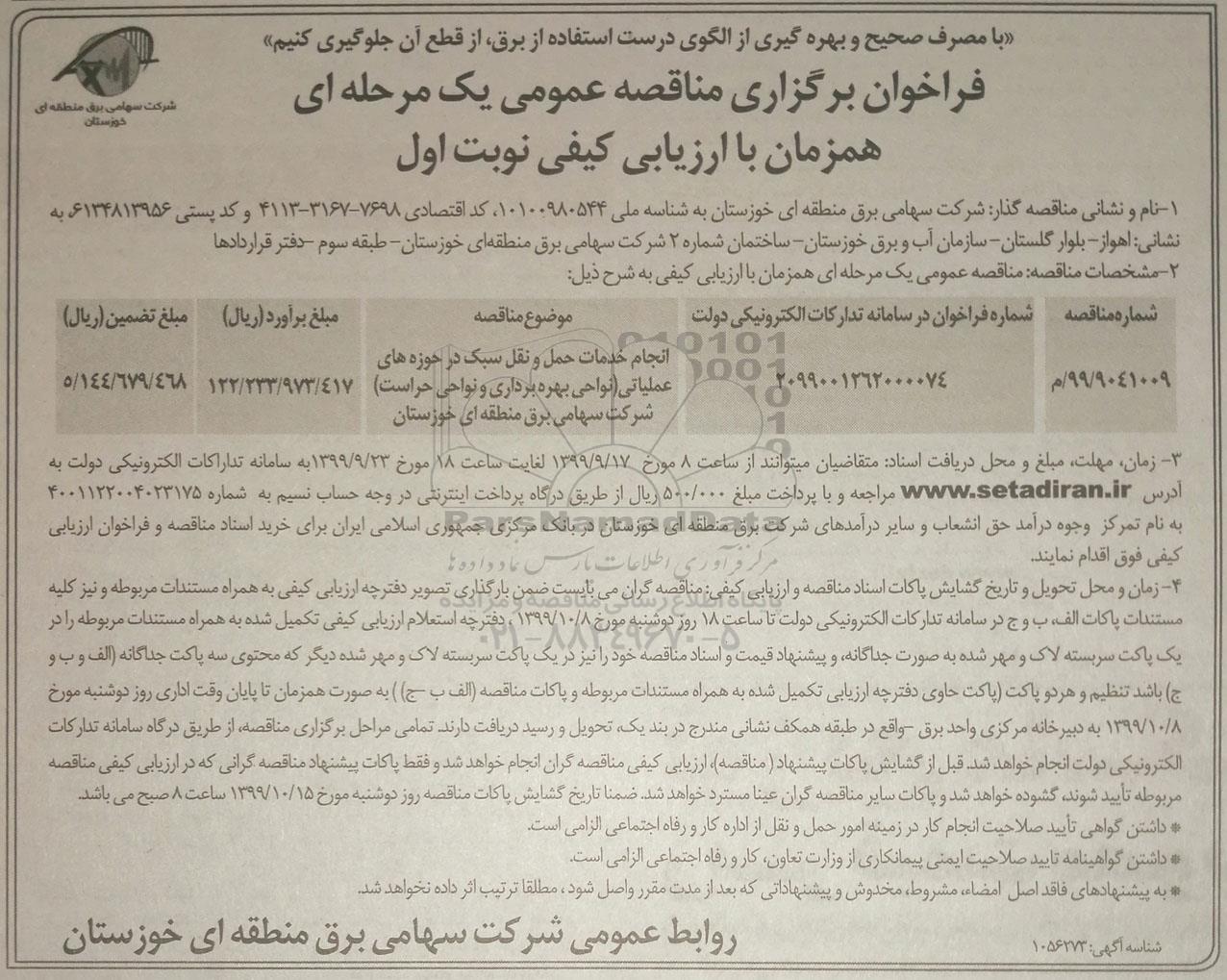 | 99/9041004/م | 2099001262000074 | انجام خدمات حمل و نقل سبک در حوزه های عملیاتی (نواحی بهره برداری و نواحی حراست) شرکت سهامی برق منطقه ای خوزستان | 122.233.973.417 | 5.144.679.468 |