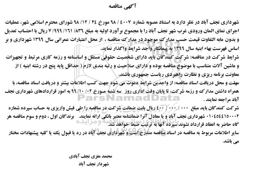 براورد اولیه به مبلغ 7.999.161.836 ریال با احتساب تعدیل و بدون مابه التفاوت قیمت حسب مدارک موجود در مدارک مناقصه از محل اعتبارات عمرانی سال 1399 شهرداری و براساس فهرست بها ابنیه سال 99 به