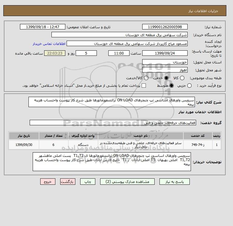 توضیحات خریدار:سرویس واورهال اساسی تپ چنجرهای ON LOAD ترانسفورماتورها ی T1,T2 پست اصلی ماهشهر T1,T2 اصلی بهبهان T5 اصلی آبادان , T1 خلیج فارس آبادان طبق شرح کار پیوست واحتساب هزینه بیمه