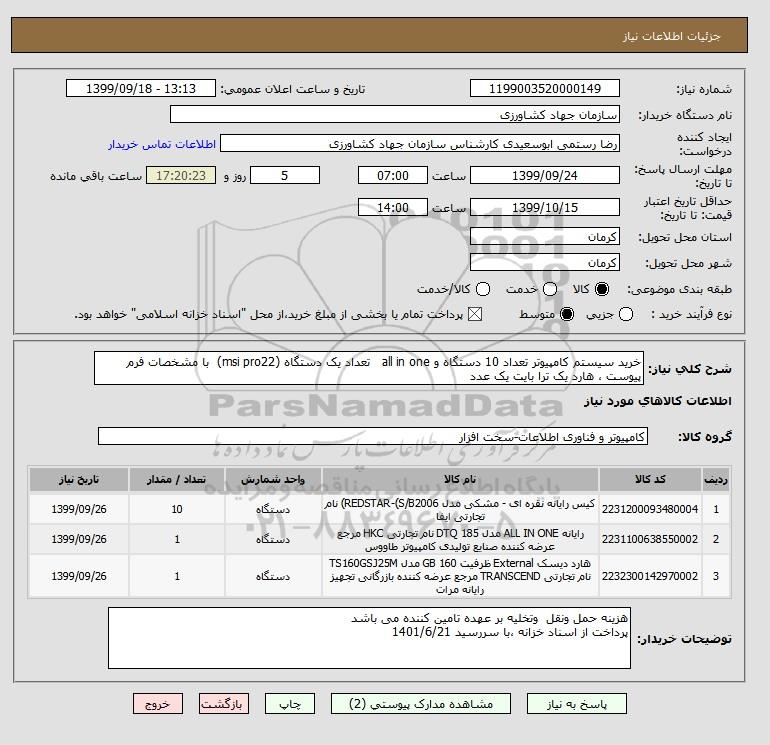 شرح کلی نیاز: خرید سیستم کامپیوتر تعداد 10 دستگاه و all in one تعداد یک دستگاه (msi pro22) با مشخصات فرم پیوست ، هارد یک ترا بایت یک عدد