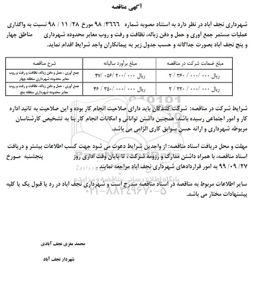 شهرداری نجف آباد در نظر دارد نسبت واگذاری عملیات مستمر جمع آوری و حمل و دفن زباله، نظافت و رفت و روب معابر محدوده شهرداری مناطق چهار و پنج نجف آباد جداگانه و حسب جدول زیر به پیمانکار واجد شرایط اقدام نماید