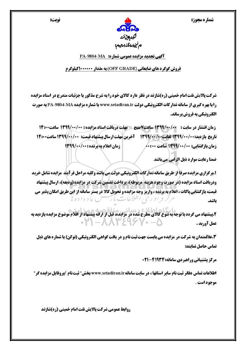 شرکت پالایش نفت امام خمینی (ره) شازند در نظر دارد کالای خود را به شرح مذکور با جزئیات مندرج در اسناد مزایده را با بهره گیری از سامانه تدارکات الکترونیکی دولت با شماره مزایده PA-9804-MA  به صورت الکترونیکی به فروش برساند.