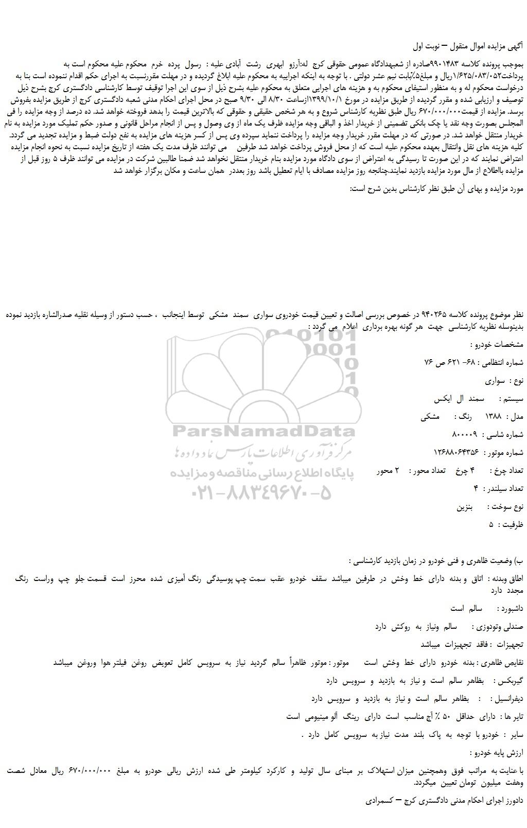بموجب پرونده کلاسه 9901483صادره از شعبهدادگاه عمومی حقوقی کرج له:آرزو ابهری رشت آبادی علیه : رسول پرده خرم محکوم علیه محکوم است به پرداخت1/625/083/052ریال و مبلغ5%بابت نیم عشر دولتی . با توجه به اینکه اجراییه به محکوم علیه ابلاغ گردیده و در مهلت مقررنسبت به اجرای حکم اقدام ننموده است بنا به درخواست محکوم له و به منظور استیفای محکوم به و هزینه های اجرایی متعلق به محکوم علیه بشرح ذیل از سوی این اجرا توقیف توسط کارشناسی دادگستری کرج بشرح ذیل توصیف و ارزیابی شده و مقرر گردیده از طریق مزایده در مورخ 1399/10/1ازساعت 8/30 الی 9/30 صبح در محل اجرای احکام مدنی شعبه دادگستری کرج از طریق مزایده بفروش برسد. مزایده از قیمت670/000/000 ریال طبق نظریه کارشناس شروع و به هر شخص حقیقی و حقوقی که بالاترین قیمت را بدهد فروخته خواهد شد. ده درصد از وجه مزایده را فی المجلس بصورت وجه نقد یا چک بانکی تضمینی از خریدار اخذ و الباقی وجه مزایده ظرف یک ماه از وی وصول و پس از انجام مراحل قانونی و صدور حکم تملیک مورد مزایده به نام خریدار منتقل خواهد شد. در صورتی که در مهلت مقرر خریدار وجه مزایده را پرداخت ننماید سپرده وی پس از کسر هزینه های مزایده به نفع دولت ضبط و مزایده تجدید می گردد. کلیه هزینه های نقل وانتقال بعهده محکوم علیه است که از محل فروش پرداخت خواهد شد طرفین می توانند ظرف مدت یک هفته از تاریخ مزایده نسبت به نحوه انجام مزایده اعتراض نمایند که در این صورت تا رسیدگی به اعتراض از سوی دادگاه مورد مزایده بنام خریدار منتقل نخواهد شد ضمنا طالبین شرکت در مزایده می توانند ظرف 5 روز قبل از مزایده بااطلاع از مال مورد مزایده بازدید نمایند.چنانجه روز مزایده مصادف با ایام تعطیل باشد روز بعددر همان ساعت و مکان برگزار خواهد شد
