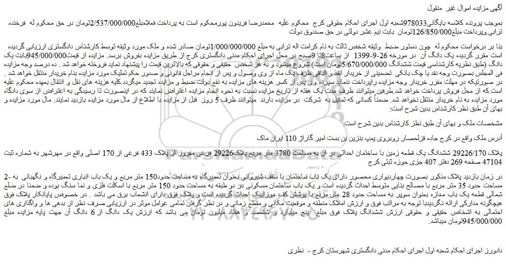 بنا بر درخواست محکوم له  چون دستور ضبط  وثیقه شخص ثالث به نام کرامت اله ترابی به مبلغ 1/000/000/000تومان صادر شده و ملک مورد وثیقه توسط کارشناس دادگستری ارزیابی گردیده است مقرر گردیده یک دانگ آن  در مورخه 26-9-1399  از ساعت8تا 9صبح در محل اجرای احکام مدنی دادگستری کرج از طریق مزایده بفروش برسد. مزایده از قیمت945/000/000بابت یک دانگ (طبق نظریه کارشناسی قیمت ششدانگ 5/670/000/000تومان است) شروع میشود و به هر شخص  حقیقی و حقوقی که بالاترین قیمت را پیشنهاد نماید فروخته خواهد شد . ده درصد وجه مزایده فی المجلس بصورت وجه نقد یا چک بانکی  تضمینی از خریدار اخذ و الباقی ظرف یک ماه از وی وصول و پس از انجام مراحل قانونی و صدور حکم تملیک مورد مزایده بنام خریدار منتقل خواهد شد . در صورتیکه در مهلت مقرر خریدار وجه مزایده راپرداخت ننماید سپرده وی پس از کسر هزینه های مزایده به نفع دولت ضبط و مزایده تجدید میگردد.کلیه هزینه های نقل و انتقال بعهده محکوم علیه است.که از محل فروش پرداخت خواهد شد.طرفین میتوانند ظرف مدت یک هفته از تاریخ مزایده نسبت به نحوه انجام مزایده اعتراض نمایند که در اینصورت تا رسیدگی به اعتراض از سوی دادگاه مورد مزایده به نام خریدار منتقل نخواهد شد. ضمناً کسانی که تمایل به  شرکت  در مزایده دارند  میتوانند ظرف 5 روز  قبل از مزایده با اطلاع از مال مورد مزایده بازدید نمایند. مال مورد مزایده و بهای آن طبق نظر کارشناس بدین شرح است: