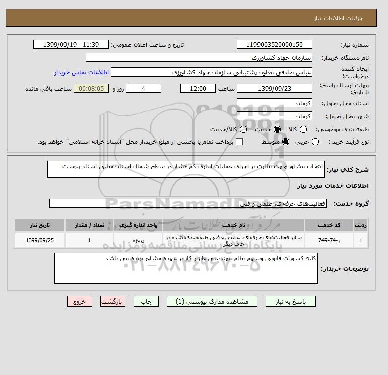 شرح کلی نیاز: انتخاب مشاور جهت نظارت بر اجرای عملیات ابیاری کم فشار در سطح شمال استان مطبق اسناد پیوست
