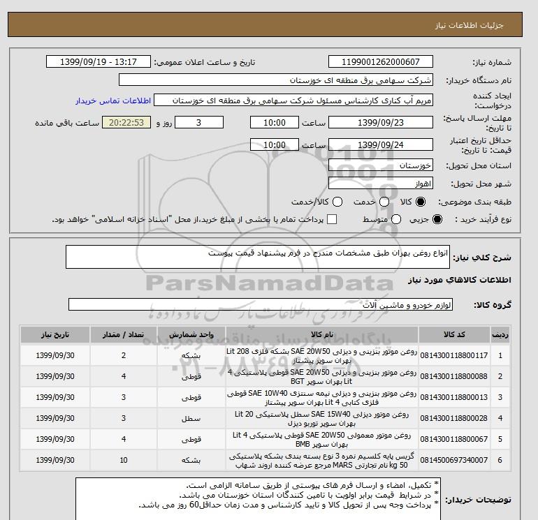 شرح کلی نیاز: انواع روغن بهران طبق مشخصات مندرج در فرم پیشنهاد قیمت پیوست
