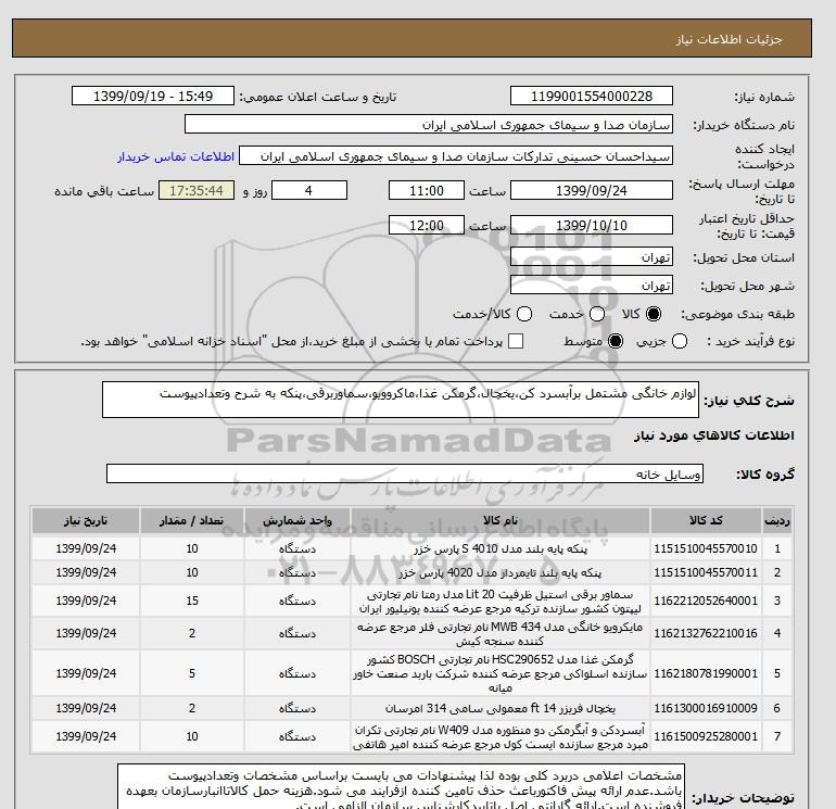 شرح کلی نیاز: لوازم خانگی مشتمل برآبسرد کن،یخچال،گرمکن غذا،ماکروویو،سماوربرقی،پنکه به شرح وتعدادپیوست