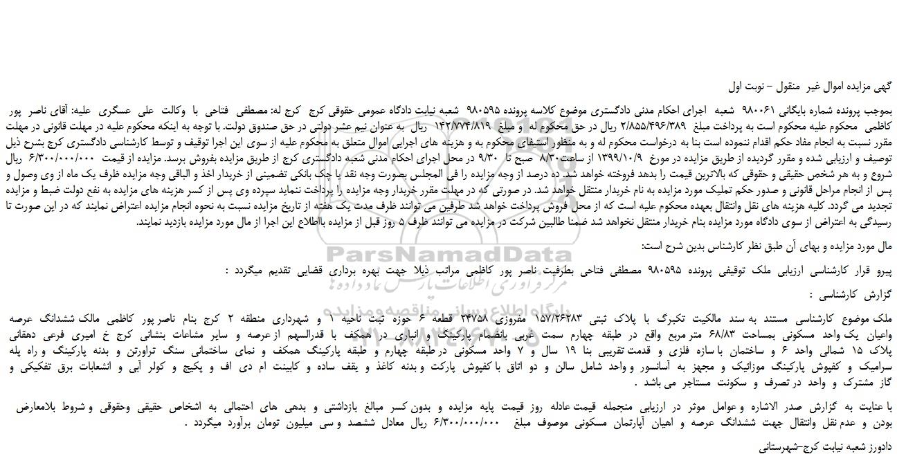 بموجب پرونده شماره بایگانی 980061 شعبه اجرای احکام مدنی دادگستری موضوع کلاسه پرونده 980595 شعبه نیابت دادگاه عمومی حقوقی کرج کرج له: مصطفی فتاحی با وکالت علی عسگری علیه: آقای ناصر پور کاظمی محکوم علیه محکوم است به پرداخت مبلغ 2/855/496/389 ریال در حق محکوم له و مبلغ 142/774/819 ریال به عنوان نیم عشر دولتی در حق صندوق دولت. با توجه به اینکه محکوم علیه در مهلت قانونی در مهلت مقرر نسبت به انجام مفاد حکم اقدام ننموده است بنا به درخواست محکوم له و به منظور استیفای محکوم به و هزینه های اجرایی اموال متعلق به محکوم علیه از سوی این اجرا توقیف و توسط کارشناسی دادگستری کرج بشرح ذیل توصیف و ارزیابی شده و مقرر گردیده از طریق مزایده در مورخ 1399/10/9 از ساعت8/30 صبح تا 9/30 در محل اجرای احکام مدنی شعبه دادگستری کرج از طریق مزایده بفروش برسد. مزایده از قیمت 6/300/000/000 ریال شروع و به هر شخص حقیقی و حقوقی که بالاترین قیمت را بدهد فروخته خواهد شد. ده درصد از وجه مزایده را فی المجلس بصورت وجه نقد یا چک بانکی تضمینی از خریدار اخذ و الباقی وجه مزایده ظرف یک ماه از وی وصول و پس از انجام مراحل قانونی و صدور حکم تملیک مورد مزایده به نام خریدار منتقل خواهد شد. در صورتی که در مهلت مقرر خریدار وجه مزایده را پرداخت ننماید سپرده وی پس از کسر هزینه های مزایده به نفع دولت ضبط و مزایده تجدید می گردد. کلیه هزینه های نقل وانتقال بعهده محکوم علیه است که از محل فروش پرداخت خواهد شد طرفین می توانند ظرف مدت یک هفته از تاریخ مزایده نسبت به نحوه انجام مزایده اعتراض نمایند که در این صورت تا رسیدگی به اعتراض از سوی دادگاه مورد مزایده بنام خریدار منتقل نخواهد شد ضمنا طالبین شرکت در مزایده می توانند ظرف 5 روز قبل از مزایده بااطلاع این اجرا از مال مورد مزایده بازدید نمایند.