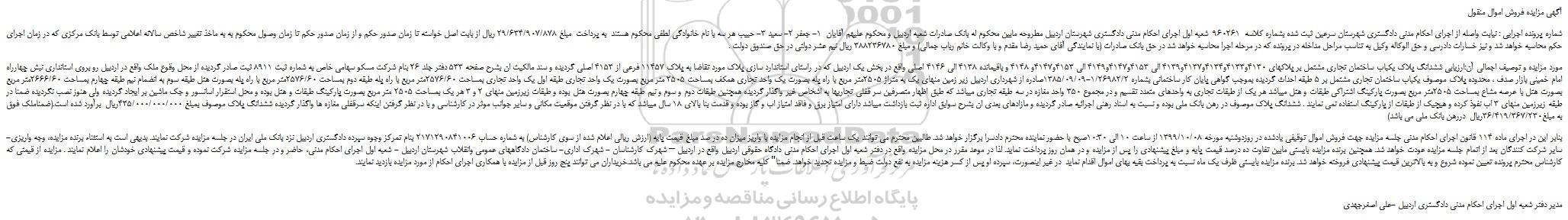 شماره پرونده اجرایی : نیابت واصله از اجرای احکام مدنی دادگستری شهرستان سرعین ثبت شده بشماره کلاسه 960261 شعبه اول اجرای احکام مدنی دادگستری شهرستان اردبیل مطروحه مابین محکوم له بانک صادرات شعبه اردبیل و محکوم علیهم آقایان 1- جعفر 2- سعید 3- حبیب هر سه با نام خانوادگی لطفی محکوم هستند به پرداخت مبلغ 29/634/907/878 ریال از بابت اصل خواسته تا زمان صدور حکم و از زمان صدور حکم تا زمان وصول محکوم به به ماخذ تغییر شاخص سالانه اعلامی توسط بانک مرکزی که در زمان اجرای حکم محاسبه خواهد شد و نیز خسارات دادرسی و حق الوکاله وکیل به تناسب مراحل مداخله در پرونده که در مرحله اجرا محاسبه خواهد شد در حق بانک صادرات (با نمایندگی آقای حمید رضا مقدم و با وکالت خانم رباب جمالی) و مبلغ 388236780 ریال نیم عشر دولتی در حق صندوق دولت .