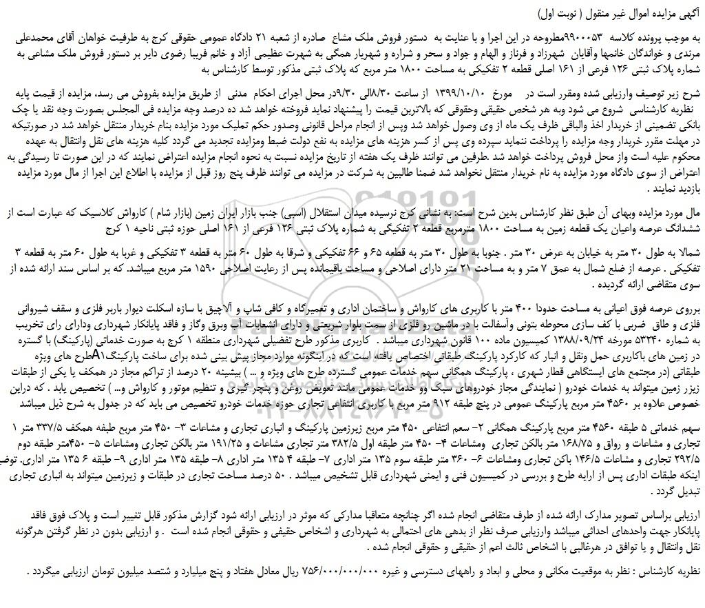 به موجب پرونده کلاسه 9900053مطروحه در این اجرا و با عنایت به دستور فروش ملک مشاع صادره از شعبه 21 دادگاه عمومی حقوقی کرج به طرفیت خواهان آقای محمدعلی مرندی و خواندگان خانمها وآقایان شهرزاد و فرناز و الهام و جواد و سحر و شراره و شهریار همگی به شهرت عظیمی آزاد و خانم فریبا رضوی دایر بر دستور فروش ملک مشاعی به شماره پلاک ثبتی 126 فرعی از 161 اصلی قطعه 2 تفکیکی به مساحت 1800 متر مربع که پلاک ثبتی مذکور توسط کارشناس به