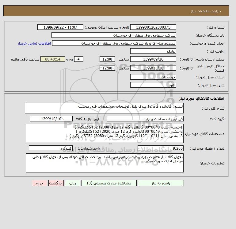 مشخصات کالای مورد نیاز: 1-نبشی سایز 8*80*80 گالوانیزه گرم 12 متری ST52 (2300کیلوگرم )