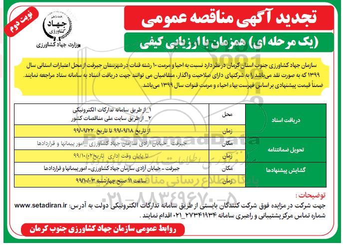 سازمان جهاد کشاورزی جنوب کرمان در نظر دارد نسبت به احیا و مرمت 10 رشته قنات در شهرستان جیرفت از محل اعتبارات استانی سال 99 به صورت نقدی می باشد را به شرکتهای دارای صلاحیت واگذار نمایند . متقاضیان می توانند جهت دریافت اسناد به سامانه ستاد مراجعه نمایند ضمنا قیمت پیشنهادی براساس فهرست بها قنوات سال 99 می باشد