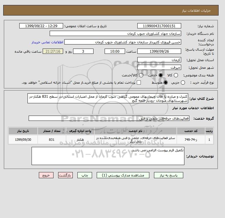 شرح کلی نیاز: کنترل و مبارزه با آفات وبیماریهای عمومی گیاهی جنوب کرمان از محل اعتبارات استانی-در سطح 831 هکتار-در شهرستانهای منوجان -رودبار-قلعه گنج